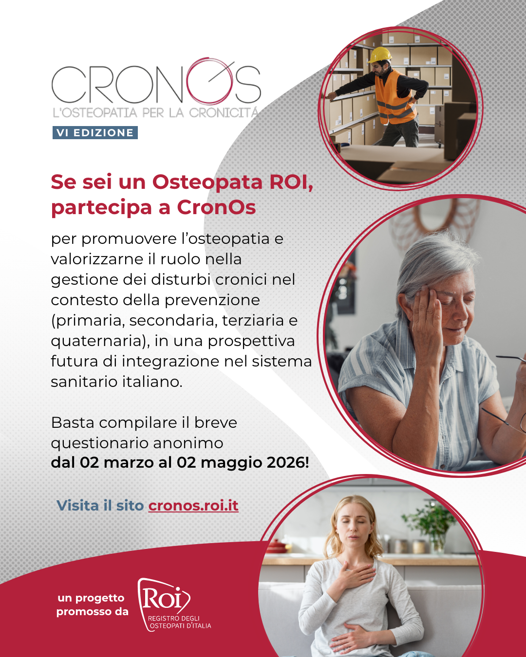 Per questo motivo, obiettivo di questa nuova edizione di CronOs è raccogliere dati sulla rilevanza dell’osteopatia nella gestione e prevenzione dei disturbi cronici della popolazione italiana, all’interno della più vasta area della prevenzione, evidenziando il contributo che noi osteopati stiamo già offrendo nella gestione della salute dei pazienti con cronicità e aprire una prospettiva futura di integrazione dell’osteopatia all’interno del sistema sanitario italiano.